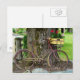 Ett foto från färg som visar en vintage-cykel med sin vackra rost-patina, som lutar mot ett gnarlat träd på någons framgård. En basket på handelbarna håller söt blommor. Anpassa valfritt objekt med egen text eller njut av som det visas.