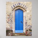 Gammal blå dörr på ett italienskt byggnad med gamla grusstenar och tegelstenar.