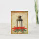 Ett gammaldags ljus med ett ljus omges av ljusröda poinsetter och grönt holly, som visas i ett rustiskt ram. Inuti står det "Season's Greetings".