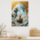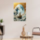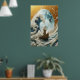 En gammal man i en liten båt fiskar i en gigantisk våg med ett stort måne i bakgrunden. Han är klädd i vita robes och håller en fiskespö. Vågen kraschar runt honom, men han verkar okänd.