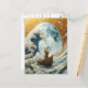 En gammal man i en liten båt fiskar i en gigantisk våg med ett stort måne i bakgrunden. Han är klädd i vita robes och håller en fiskespö. Vågen kraschar runt honom, men han verkar okänd.