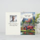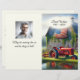 Gammal röd jordbrukstraktor av en rustik trälada med en amerikansk flagga för begravning eller minnesarbete. All text och alla personliga foton kan ändras.