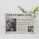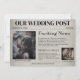 Denna unika spara datum för bröllopsinbjudan har ett gammalt tidningstema. Bakgrunden har ett urblekt mönster som liknar en tidning. Rubriken "spännande nyheter" är tryckt ovanför en exempelartikel om förlovningen och datumet för bröllopet. En bild av paret är placerad till vänster. Den nedre delen har en extra "Helguppdatering" -del av tidningen där paret kan framhäva sitt husdjur eller något speciellt för dem, samt inkludera sitt eget anpassade husdjursfoto eller annan bild.