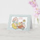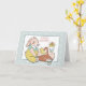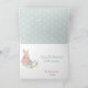 På framsidan av detta vackra påskkort finns en gammaldags påskhare iklädd tealgrön och gul klänning, sittande bredvid en korg. Inuti korgen finns en liten gul kyckling. Texten ovanför säger "God Påsk" i mjuk rosa. En ram med mönster omger bilden och texten. Inuti finns fler anpassningsbara textfält i rosa och pastell tealgrön. Längst ner finns ytterligare en bild på haren med en vattenkanna.