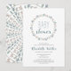En sällsam, fantasifull och stiliserad handritad blomsterkrans i dammig blå och pastell lila nyanser baby shower inbjudan. Enkel och konstnärlig i mjuka pasteller, med en blomsterrik scriptstil kontrasterad med en enkel handritad stil. Den stora överraskningen är när du vänder på inbjudan och hittar det vackra koncentriska cirkelspiralmönstret på baksidan, med ett litet hjärta i mitten. För en enkel konstnärlig stil.