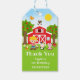 Denna söta och roliga presentetikett visar en pojke med blondt hår och ljus hy bredvid en röd lada med en väderkvarn i form av en tupp. Det finns söta gårdsdjur som en ko, gris och höna. I bakgrunden syns en klarblå himmel, äppelträd, solsken, fjärilar och tusenskönor. Texten kombinerar feta och sans-serif-typsnitt för en stilren och modern look. Detta är perfekt för en gårdsinspirerad födelsedagsfest.