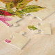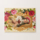 Saint Ro i Lima omges av en arrangemang av vackra, färgstarka blommor och rulla. En bakgrund med gult brocade kompletterar det utsökta bildkollage som finns.