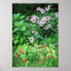 Bilder från sommarträdgården poster ljusa lilor med orange och rödnasturtium med varierat blad. De stora löven av en vattentäkt fullföljer också lodräts blommigt poster.
