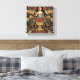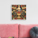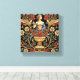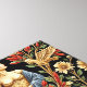 A young woman with blonde hair, wearing a blue dress, sitting on a golden vase, with two golden eagles on the sides, flowers and leaves on a black background.