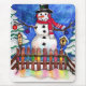 Ursprunglig vattenfärgning av Sandra Gale i lycklig snögubbe i en vinterträdgård täckt av snö. Underbar design för trädgårdsmästare, barn, Mammor och alla som gillar snögubbar och trädgårdsscener i land.