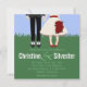 Ett par i bröllop ligger i händer på en grå fält med blå himmel-bakgrund. Branden bär en vit klänning med rött streck, ett par röda skor och bär ett stort gäng röd ros. Gumman bär svart byxor, några svarta och vita skor och en grått tuxedo-jacka.