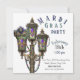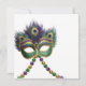 Mardi Gras party invitation featuring a antiqued gas lamp with hanging Mardi Gras beads and mask. Customize this party invitation with all your details. The reverse of this invite features a Mardi Gras mask and beads.