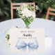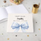 En beige, krämfärgad bakgrundsfärg. Dekorerad med en stor ljusblå slinga. Personifiera och lägg till namn och datum.