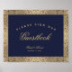 En vintage, elegant alfabetisk vigselskylt, rekommenderad för ett bröllop med marinblå och gyllene bröllopsfärger. Bakgrunden är marinblå. Den har blomstergyllene ramar med invecklad vildrosordekorationer. All text är gyllene. Orden Gästebok och namnen är skrivna med en elegant kalligrafisk stil, resten i versaler. Meddelandet "var snäll och signera vår" är välvd ovanför orden "Gästebok"