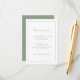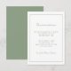 Elegant informationskort för bröllop med minimalistisk design med en enkel ram i salvia grön på en krispig vit bakgrund. Traditionell formulering ger tidlös men modern förfining. Anpassa denna bröllopsdesign med dina detaljer i vacker salvia grön bokstav och skrivstil. Baksidan av kortet matchar i enfärgad salvia grön. För bästa resultat, hoppa över mellanslag och använd versaler enligt exempel. Meddela med Zazzles meddelande funktion eller e-posta invitationsuites@gmail.com med frågor eller anpassade färgförfrågningar.