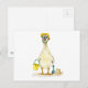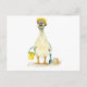 Söt gåsunge med en sandhink och hatt på semester och bygger sandslott