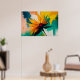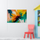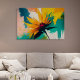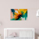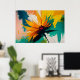 Detta djärva abstrakta konstverk fångar ett ögonblick av explosiv rörelse och ljus, där en blomliknande form tycks brista utåt i en dramatisk svepande rörelse av färg. Gyllene gula och varma orangea kronblad strålar ut från en djup karmosinröd kärna och skär dynamiskt genom en bakgrund av teal, smaragdgrönt, mjukt rosa och strukturerade neutrala toner. Kompositionen känns instinktiv och kraftfull, som om naturen själv fångas i rörelse.