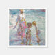 A mother, sunhat gently tilted, guides two children through a shimmering tidepool of color and light. They bend in curiosity, searching for sea-treasures beneath the ripples — shells, stones, maybe memories. The scene captures the innocence of childhood and the quiet strength of maternal presence. Waves glisten in hues of turquoise and lavender, while soft shadows dance in sun-washed sand. There's movement, but also stillness — like a moment suspended in warm salt air.