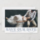 Meddela ditt bröllop-datum med det här klassiska fotot spara datumkortet. Den har blå konsdeco-typografi med matchande mönster. Anpassa genom att lägga till foto och information. Det här elegant vintagen spara datum meddelande är perfekt för Gatsby-temat bröllop.