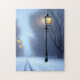 Viktoriska gatulampor som glatt sig på en snöslang på vintern land.