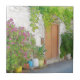 Gatuvy över vattenfärg med färgade blommor, dörr och stenvägg på Cypern