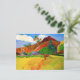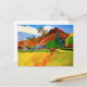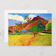 Paul Gauguin Mountains på Tahiti-vykort. Oljemålning om landskap från 1893. En av Gauguins mest berömd målningar, Bergen i Tahiti, eller Tahitiska berg, uppvisar Gauguins pulserande använda färg och kärlek för det tropiska landskapet. Den här målningen har en man som bär med sig en produkt som är på väg mot röda berg och spolar handflatan träd med grönt och orange. En hund står i avstånd i fält med ett skarpt gräs av gult nära mjuka gröntar. En underbar gåva till fläkt av Paul Gauguin, Cloisonism, Tahiti och tropisk målning.