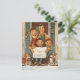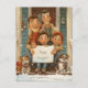 Det här är ett toppen vykort för att fira nya år, jul eller liknande evenemang. I denna utformning finns det två far med sina barn och hundar sitta på porten till deras hus under snö. De håller en banderoll med anpassade.