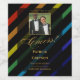 Fira med personliga vinetiketter för bröllop med brudgummarnas namn, bröllopsdatum, bröllopsfoto och anpassningsbar druvsort. Kraftiga diagonala regnbågsränder på svart med elegant scripttypografi skapar en modern, manlig design som förvandlar vinflaskor till minnesvärda bröllopsgåvor eller dekorationer för mottagningstabellen. Helt anpassningsbar med era namn, firande datum, foto och vinsort (Cabernet, Chardonnay, blandning, etc.). Perfekt för samtida HBTQ-par som skapar unika, personliga bröllopsgåvor som gästerna kommer att värdesätta. Koordinerar vackert med vår kompletta Gay Men Wedding Collection.