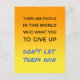 Detta är ett inspirerande vykort, med ett citat som uppmuntrar er till positiv tänka och vara stark. "DET FINNS MÄNNISKOR I DEN HÄR VÄRLDEN SOM VILL ATT DU SKA GE UPP. LÅT DEM INTE VINNA". Texten är svart och blå, på en ljus gult och orange.
