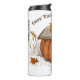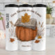 Den här stilla bilden har en stor pumpa med en öppen bibel som vilar på toppen, försedd med en enda höst löv. Utformningen omfattar frasen "Ge tack vare Herren" och hänvisningen "Psalm 107:1", som på ett vackert sätt blandar ett budskap om tro med ett säsong-tema.