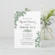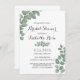 Den vackra inbjudan har grönt eukalyptus löv på en vit bakgrund på både fram och bak. Perfekt för vår, utomhus eller grönt bröllop.