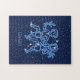Pussel med zodiaksymbolen för Gemini i mjuk silver-blått, överdragen med stjärnorna i konstellationen, mot bakgrund av himlar från djup midnattsblå till svart.