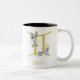 Personlig dammigt blått blommigt kaffe mugg med guld sparkly Gemini zodiac-symbol med blommotiv från boho