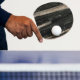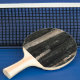 Den moderna pingpongpaddeln har ett foto av en svart och vit strimlad gemsten. Den här giftet visningar vita kristaller och svart sten som komen tillsammans bildar lodrät rand mönster.