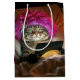 En Gen Z tabby katt med en vibrerande rosa som ljuger i sängen, inräknad i en tablett som avger en mjuk glöd. Text kan ändras.