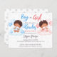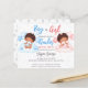 Gender av pojke eller flicka avslöjar party budgetinbjudan. Traditionell rosa och blå söt pojke och flicka baby sitta på ett moln, kramande hjärta med ballonger.