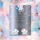 För en gender, visa babyduschen. En modern faux-metalliskt tittar bakgrund i silver. Dekorerad med glitter och blått, rosa och vita ballonger och glitter stoft. En pojke-elefant och en gaby-flicka-elefant. Anpassa och lägg till närmare uppgifter om namn i mamma och party. Namn och texten: Boy eller Girl är skriven med ett handskript i stil