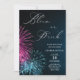 Ett fyrverkeritema med genderna baby visar en partiinbjudan. Den vita elegantens typografitext lyder "blå eller rosa", på himlar under nätterna, med exploderande blåa och rosa. Anpassa genom att redigera den digitala eller tryckta inbjudan med din unika händelseinformation.