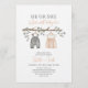 He or She? What will baby be? A cute gender reveal invitation featuring baby boy and baby girl clothes hanging on tree branch.