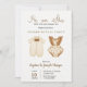 Gender reveal party invitation card featuring pastel outfits: a beige romper and brown overalls. Elegant, warm tone, with event details beneath.