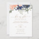 Vänner och familj i inbjudan till en gender visar med denna vackra inbjudan rosa och blåfärgade blommor med guld typografi.