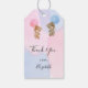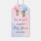 För en modern boho stil babydusch avslöjar gender party. En blå, rosa, vit, vattenfärgad bakgrund och två nallar med ballonger. Anpassa och lägg till ett namn och ett datum.