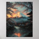 A breathtaking digital painting of Mount Fuji framed by blooming cherry blossoms, a tranquil river, and a distant temple. Warm sunset hues meet cool blues for a moody, serene Japanese landscape. Rich brushwork and glow create a cinematic scene—perfect wall art for zen spaces, nature lovers, and travel-inspired interiors. Evokes calm, beauty, and timeless scenery.