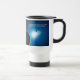 En stiliserad bild i blå toner och vit av jorden och Måne med bakgrundsbelysning från sol. En engelsk översättning av Genesis 1:4 som lyder "Gud såg att ljuset var bra och Gud delade ljuset från mörkret" visas också i blått och vitt. Lägg till ytterligare text.