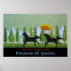 "Springa med oss genom vilden" står det på första raden. "Bevara alla arter" står det på andra raden. Välj storlek eller anpassa den här färgstarka poster med egen text! Silhouetterna från två hästar gallopar genom en grönt ängsmark, med gräs träd, berg och solnedgång. Textuell bakgrund. En illustration från en blandad mediekonst av Minerva Bloom för Angela Piraino: www.angelapiraino.weebly.com