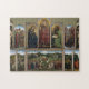 Panelerna är uppdelade i två register över lodräna, med dubblor av vikta vingar som innehåller inre och yttre panelfärger. Det övre registret över de inre panelerna representerar den himmelskare inlösen och innefattar Kristus deës Kung (eller kanske Gud Far), Jungfru Mary och John Baptist. De flankeras i nästa paneler av änglar som spelar musik och, på de yttersta randpanelerna, figurer från Adam och Kväll. De fyra undre registerpanelerna är indelade i två par. Skulptural grisaille målningar av Johannes Baptist och Johannes Johannes Evangelist, och på de två yttre panelerna, donator porträtt av Joost Vijdt och hans fru Lybette Borluut. Den centrala panelen i det lägre registret visar en samling helgon, syndare, präster och soldater som är närvarande vid en tillrättavisning av Guds Lamb. Det finns flera grupper av figurer som kontrolleras av den Heliga andningens duva.[A] Altarpjäsen är en av de mest kända och viktiga konstverken i Europas historia. Offert:Wikipedia