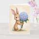 Designed with a gentle digital illustration style, the front shows a light-brown bunny with long ears and a fluffy white tail sitting on soft green grass 🐰. Its big dark eyes catch small highlights, and a tiny rosy nose and slight smile give it a sweet, friendly look, like it’s waiting to share a quiet moment. The bunny holds a rounded bouquet close to its chest, as if offering it with shy affection, the stems tucked neatly between its paws. The flowers form a full cluster that shifts from airy sky blue to pale lavender, with layered petals that look soft and full. Behind the scene is a creamy, watercolor-like background with faint texture and diffused light that keeps everything calm and tender. A short Easter greeting sits near the top in a simple, medium-size font, colored in soft lavender to match the blooms 🌷. Green leaves and sturdy stems fan outward beneath the bouquet, adding natural detail against the light backdrop.