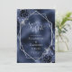 Den här eleganten har det moderna bröllop spara datum-kortet ett silver-geometriskt ram som är dekorerat med marinblått och silver blommigt buquets på en marinblå faux-folie. I anpassadet kombineras silver grått med fysisk handskrift, tryckplåt och kursivt typsnitt.