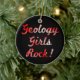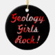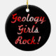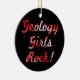 Den här hängande prydnadsformen innehåller frasen "Geology Girls Sten!" För att de gör det! Teckensnittet är rött med ett grumligt mönster.