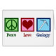 Peace Kärlek Geology. Ett geologiskt forskningskort för coola för en geolog som studerar jordvetenskap och sten genom jordens geologiska historia. Det har ett sött fredstecken, hjärta och geologer sten hammer.
